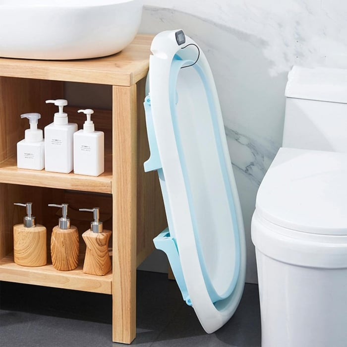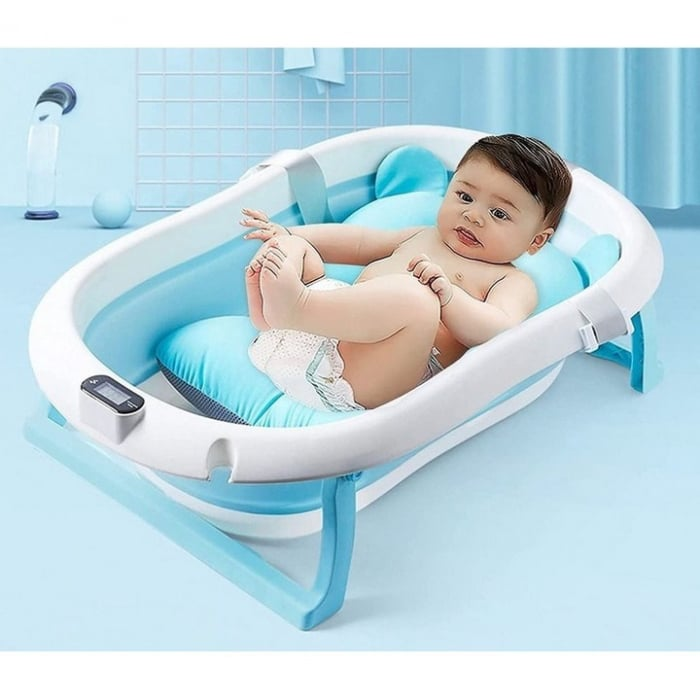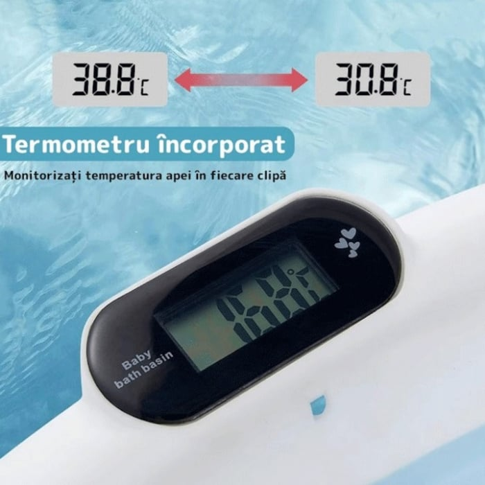 Cadita cu pernuta pentru bebelusi, termometru digital incorporat, pliabila, dop de scurgere, picioare anti-alunecare, design ergonomic, 75 x 45 x 22 cm, Albastru