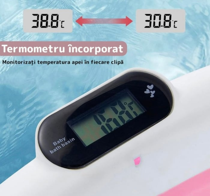 Unul dintre cele mai utile si inteligente aspecte ale acestei cadite este termometrul electronic incorporat. Cu ajutorul acestuia, parintii pot verifica in mod precis temperatura apei din cadita pentru a se asigura ca aceasta este ideala pentru baia bebelusului. Astfel, se evita riscul expunerii la apa prea calda sau prea rece, asigurand o baie confortabila si sigura.