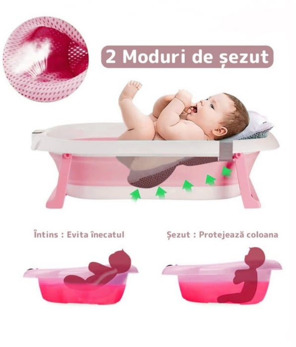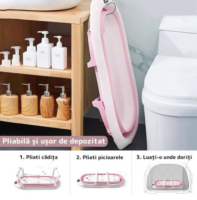 Un alt avantaj major al acestei cadite este caracteristica sa pliabila. Cu ajutorul unui sistem ingenios, cadita poate fi pliata cu usurinta pentru a economisi spatiu in baie sau pentru a fi transportata cu usurinta in calatorii sau vizite la prieteni si rude. Acest aspect face din aceasta cadita un accesoriu practic si versatil pentru parintii activi si in miscare.