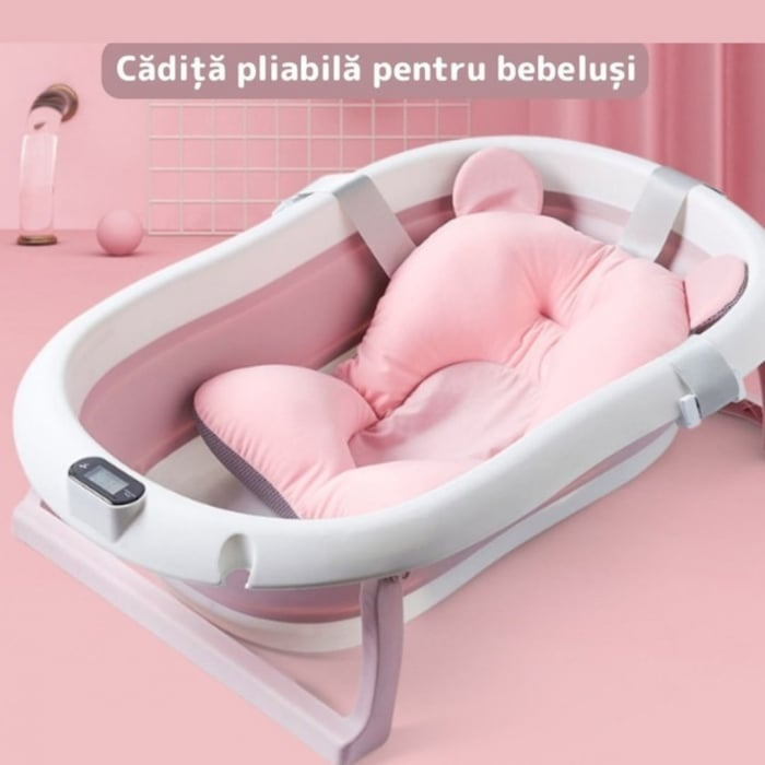 Cadita cu pernuta pentru bebelusi, termometru digital incorporat, pliabila, dop de scurgere, picioare anti-alunecare, design ergonomic, 75 x 45 x 22 cm, Roz