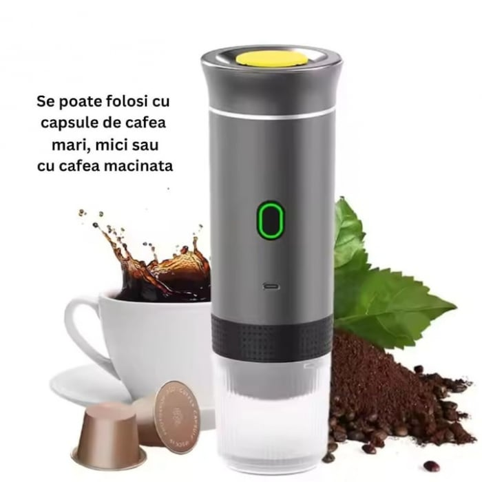 Espressor electric portabil, Aparat de cafea portabil, cafea macinata, capsule Nespresso, Nescafe, Dolce Gusto, mod incalzire apa sau cafea rece, putere 72W, baterie 2500mAh, incarcare USB C