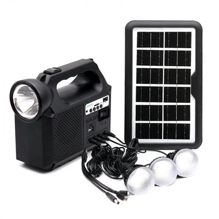 Kitul cu panou sistem solar pentru iluminat GD-8017 MUSIC este ideal pentru momentele in care nu dispuneti de energie electrica in camping la pescuit in drumetii.